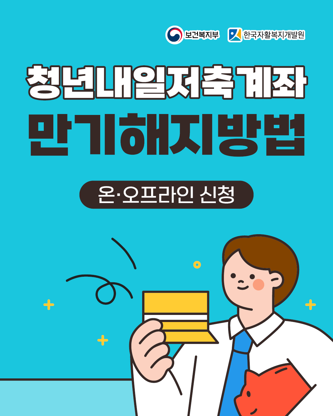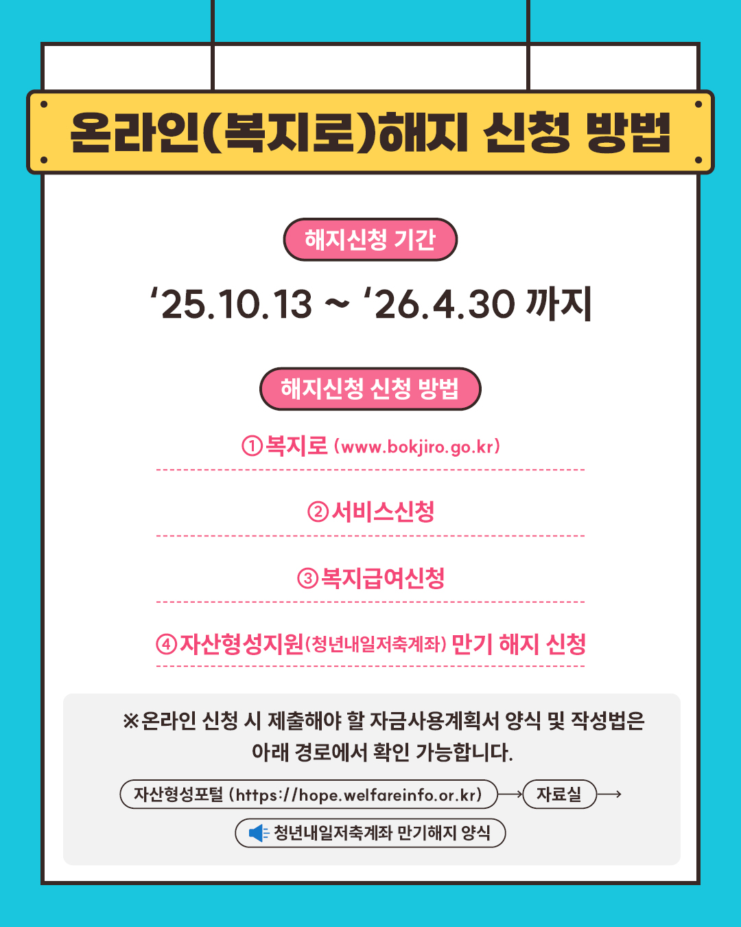 ㅇ (방법) 복지로(www.bokjiro.go.kr) > 로그인 > 서비스신청 > 복지급여 신청 > 자산형성지원(청년내일저축계좌) 만기해지 신청
