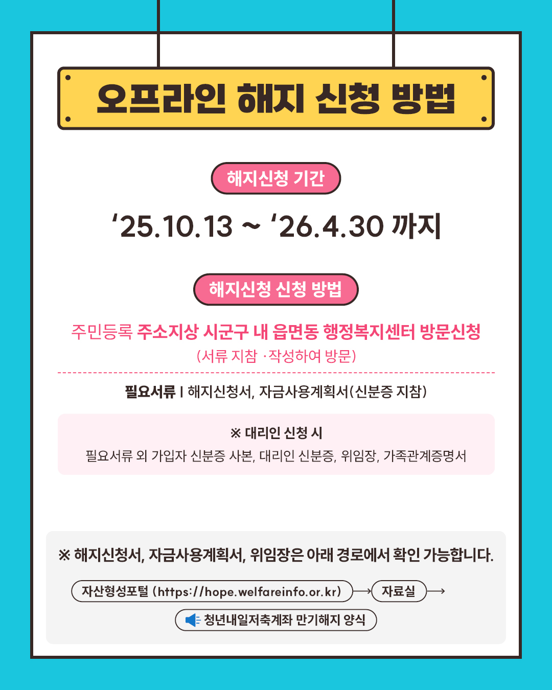 ㅇ (방법) 해지신청서 작성 후 주민등록상 주소지 읍면동 행정복지센터 방문 제출